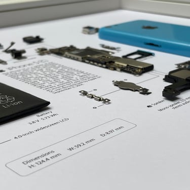 Entdecke dieses exklusive, handgefertigte Wandbild: Ein auseinandergebautes iPhone, kunstvoll und detailverliebt hinter Glas arrangiert, das jedes einzelne Bauteil sichtbar macht und die faszinierende Technik in einem hochwertigen weißen Holzrahmen präsentiert (Rahmengröße: 33 x 43 cm). Das beeindruckende Unikat eignet sich perfekt als Blickfang für moderne Wohnzimmer, Büros oder das Homeoffice und begeistert nicht nur Technik-Liebhaber, sondern alle, die außergewöhnliches Design schätzen. Ideal als Geschenk oder zur eigenen Inspiration - mach dein Zuhause zu einer Galerie ingenieurtechnischer Kunst!